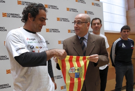 El director general del Deportes del Gobierno de Aragón, Félix Brocate, ha hecho hoy entrega del banderín que Carlos Pauner y Raúl Martínez llevarán en su próxima expedición hacia el Everest