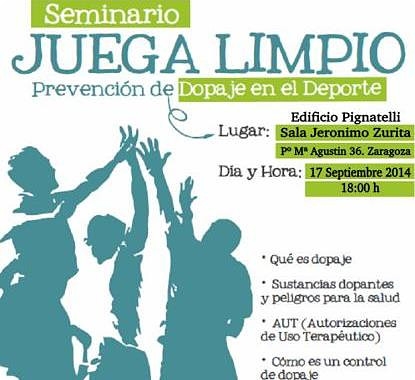 La Dirección General del Deporte del Gobierno de Aragón, en colaboración con la Agencia Española de Protección de la Salud en el Deporte, convocan el Seminario Juega Limpio: Prevención de dopaje en el deporte, una iniciativa que desarrollará actuaciones encaminadas a fomentar los valores éticos en la práctica deportiva con especial interés en los jóvenes deportistas, promoviendo el juego limpio y saludable y la competición en igualdad de condiciones.