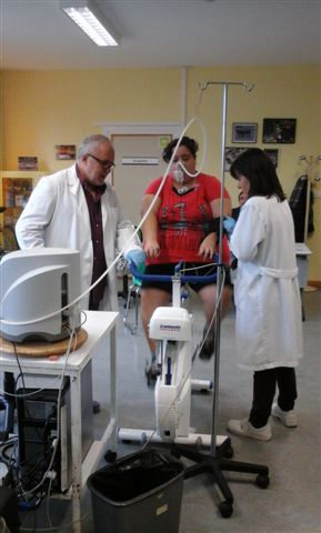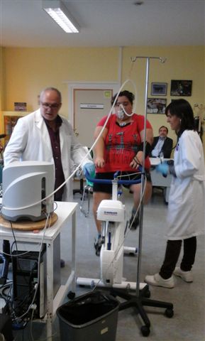 - Prueba de esfuerzo sobre cicloergómetro bajo monitorización ECG continua de 3 derivadas, con análisis de intercambio de gases respiración a respiración y toma de tensión arterial cada 4 minutos, cargas de 2 minutos y subida de vatios proporcional a la presumible condición física del sujeto.