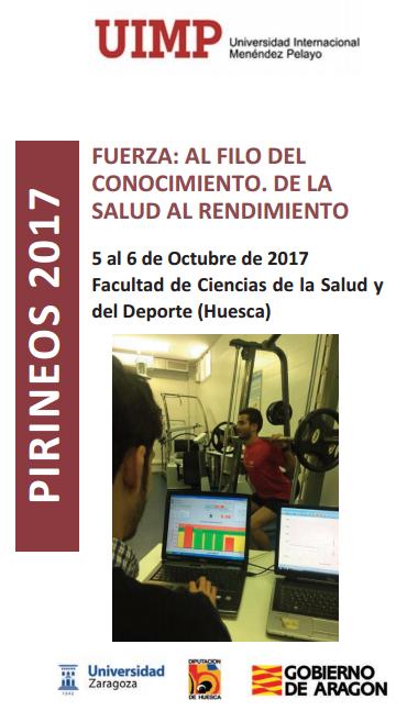 Incluido en el Programa de Formación Permanente del Deporte Aragonés 2017-2018 la Universidad Internacional Menéndez Pelayo sede Pirineos, la Facultad de Ciencias de la Salud y del Deporte de la Universidad de Zaragoza y la Dirección General de Deporte del Gobierno de Aragón organizán la jornada formativa sobre "FUERZA: AL FILO DEL CONOCIMIENTO. DE LA SALUD AL RENDIMIENTO", que se realizara durante los dias 5 y 6 de octubre de 2017 en la Sala de Conferencias de Vicerrectorado de Huesca (Dirección: Ronda Misericordia, 5 de Huesca)